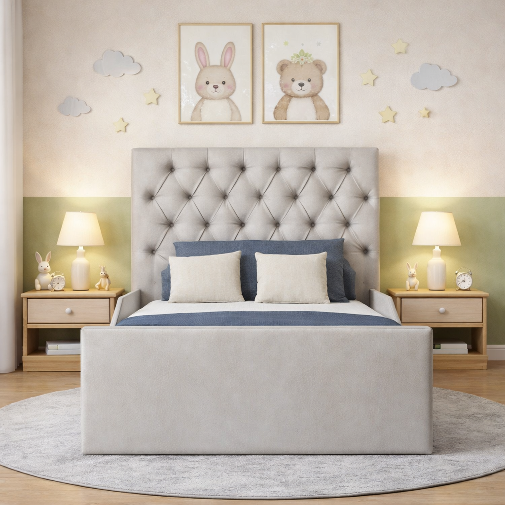 Introducing the Chesterfield Kids Bed. This stylish and comfortable bed is perfect for your child's bedroom. With its classic chesterfield design and premium materials, it ensures a good night's sleep. Made with durable and safe materials, this bed is built to last.